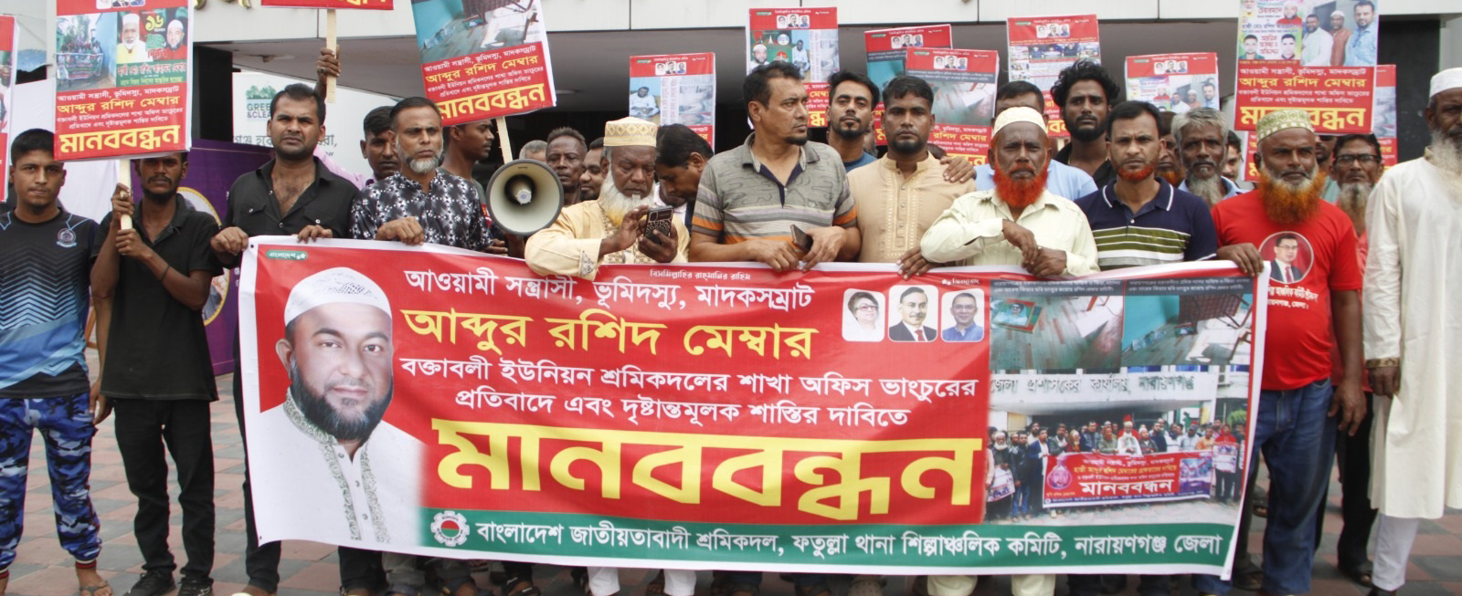 ডান্ডিবার্তা রিপোর্ট বৈষম্যবিরোধী ছাত্র আন্দোলনে নিহত ইয়াসিন হত্যা মামলায় গ্রেপ্তার বক্তাবলী ইউনিয়ন পরিষদের ভারপ্রাপ্ত চেয়ারম্যান রশিদ মেম্বারের ফাঁসি দাবিতে আদালত চত্বরে মানববন্ধন করেছেন ফতুল্লা থানা শ্রমিক দলের নেতৃবৃন্দ। গতকাল রবিবার সকালে