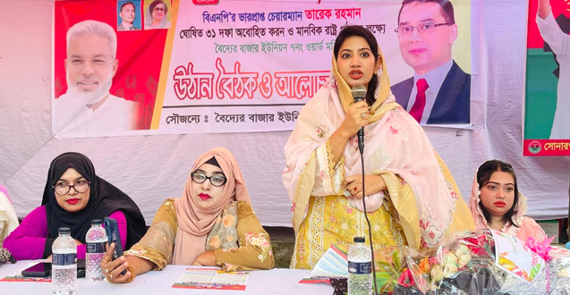 বাংলাদেশ জাতীয়তাবাদী দল (বিএনপি)-এর ভারপ্রাপ্ত চেয়ারম্যান তারেক রহমান ঘোষিত রাষ্ট্রকাঠামো মেরামতের রূপরেখার ৩১ দফা বাস্তবায়নের লক্ষ্যে নারায়ণগঞ্জের সোনারগাঁয়ে নারীদের অংশগ্রহণে একটি ব্যাতিক্রমী উঠান বৈঠক, মুক্ত আলোচনা ও ৩১ দফার লিফলেট বিতরণ করেছে উপজেলা মহিলা দল। গতকাল সোমবার বিকেলে উপজেলার বৈদ্দ্যেরবাজার ইউনিয়নের পঞ্চবটি এলাকার মতিউর রহমান হাই স্কুল প্রাঙ্গণে এ ব্যাতিক্রমী সভা অনুষ্ঠিত হয়। বিএনপির কেন্দ্রীয় নির্বাহী কমিটির সদস্য, সোনারগাঁ উপজেলা বিএনপির সভাপতি ও নারায়ণগঞ্জ-৩ আসনের বিএনপির মনোনয়ন প্রত্যাশী আজহারুল ইসলাম মান্নানের নির্দেশনায় অনুষ্ঠানটি পরিচালনা করেন উপজেলা বিএনপির মহিলা বিষয়ক সম্পাদক সালমা আক্তার কাজল। এ সময় প্রধান অতিথি হিসেবে উপস্থিত ছিলেন আজহারুল ইসলাম মান্নানের পুত্র ও নারায়ণগঞ্জ জেলা যুবদলের সিনিয়র যুগ্ম-আহŸায়ক খাইরুল ইসলাম সজিবের সহধর্মিণী সাদিয়া ইসলাম জুঁই এবং বিশেষ অতিথি হিসেবে উপস্থিত ছিলেন বোন মারিয়া ইসলাম মুন্নি। তারা সভায় এলাকার সাধারণ নারীদের সঙ্গে সরাসরি মতবিনিময় করেন। সাদিয়া ইসলাম জুঁই বলেন, “আজকের নারী শুধুমাত্র সংসার সামলায় না, দেশও সামলায়। আমরা চাই এমন বাংলাদেশ, যেখানে আমাদের সন্তানেরা নিরাপদ থাকবে, যেখানে ভোট দিতে পারব নিজের ইচ্ছায়, যেখানে ন্যায়ের শাসন ফিরবে। বিএনপি সেই স্বপ্নের রাজনীতি করছে—মানুষের অধিকার ফিরিয়ে আনার রাজনীতি।” আপনাদের সবাইকে ধানের শীষে ভোট দিয়ে বিএনপিকে রাষ্ট্র পরিচালনায় সহযোগিতা করার অনুরোধ করছি। মারিয়া ইসলাম মুন্নি তাঁর আবেগঘন বক্তব্যে বলেন,“এই দেশটা আমাদের, কিন্তু আজ আমরা আমাদেরই অধিকার থেকে বঞ্চিত। আমাদের মা-বোনেরা কষ্টে আছে, ন্যায্য মূল্য পাচ্ছে না। তাই ৩১ দফা শুধু রাজনৈতিক প্রতিশ্রæতি নয়, এটা আমাদের বাঁচার স্বপ্ন। আমরা সবাই মিলে সেই স্বপ্ন বাস্তবায়ন করব।”তারেক রহমানের সে স্বপ্ন বাস্তবায়নে আমার বাবা তার পুরো জীবন আপোষহীনভাবে জনগণের স্বার্থে অন্যায়ের বিরুদ্ধে লড়ে গেছেন। আশা করি আপনারা বিএনপির পাশে থাকবেন। একই সাথে সোনারগাঁ আসনটি তারেক রহমানকে উপহার দিবেন। এসময় অন্যান্য বক্তারা বলেন, তারেক রহমানের নেতৃত্বে বাংলাদেশ আবারও গণতন্ত্র, মানবাধিকার ও ন্যায়বিচারের পথে ফিরবে। জনগণের সরকার প্রতিষ্ঠা ছাড়া দেশের মুক্তি নেই। অনুষ্ঠানে অন্যান্যদের মধ্যে উপস্থিত ছিলেন, বৈদ্দ্যেরবাজার ইউনিয়নের সভাপতি তাজুল ইসলাম সরকার, সাধারণ সম্পাদক মোশাররফ হোসেন, মোস্তাক হোসেন, রাকিব হাসান, কাউসার আহমেদ, সোহেল প্রধান, সেলিম হোসেন দিপু, আলিনুর বেপারীসহ কয়েক’শ নেতৃবৃন্দ। অনুষ্ঠান শেষে উপস্থিত নারীদের হাতে হাতে ৩১ দফা বাস্তবায়